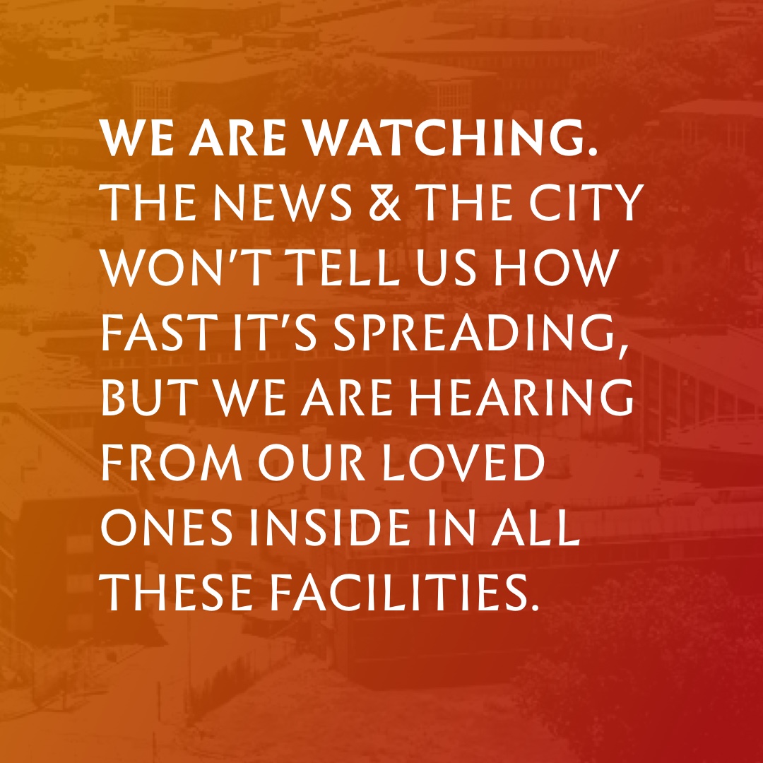 We are watching. The news and the city won’t tell us how fast it’s spreading, but we are hearing from our loved ones inside all these facilities.